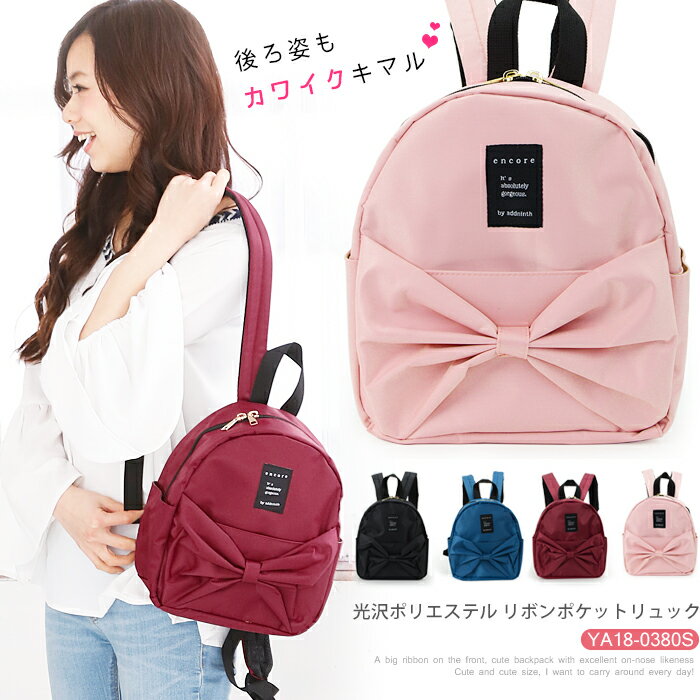 リュック リュックサック レディース リボン 大人 かわいい 光沢ポリエステル リボン ポケット リュック (sp-YA18-0380S) バッグ バックパック 女子 高校生 中学 おしゃれ 通学 オシャレ 黒 小さめ ミニ 大きめリボンが可愛いリュック♪