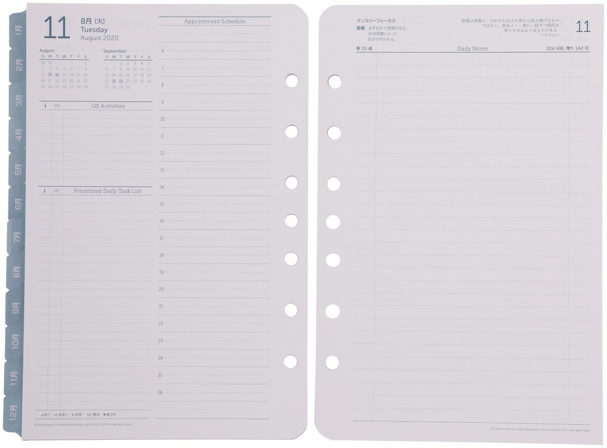 クラシックサイズ (A5変形サイズ) 7穴オリジナル・デイリー・リフィル 日本語版見開き1日2ページ2020年7月10月始まり兼用リフィル 多忙な毎日を確実にマネジメントするための機能が満載の1日2ページ、デイリーリフィル。